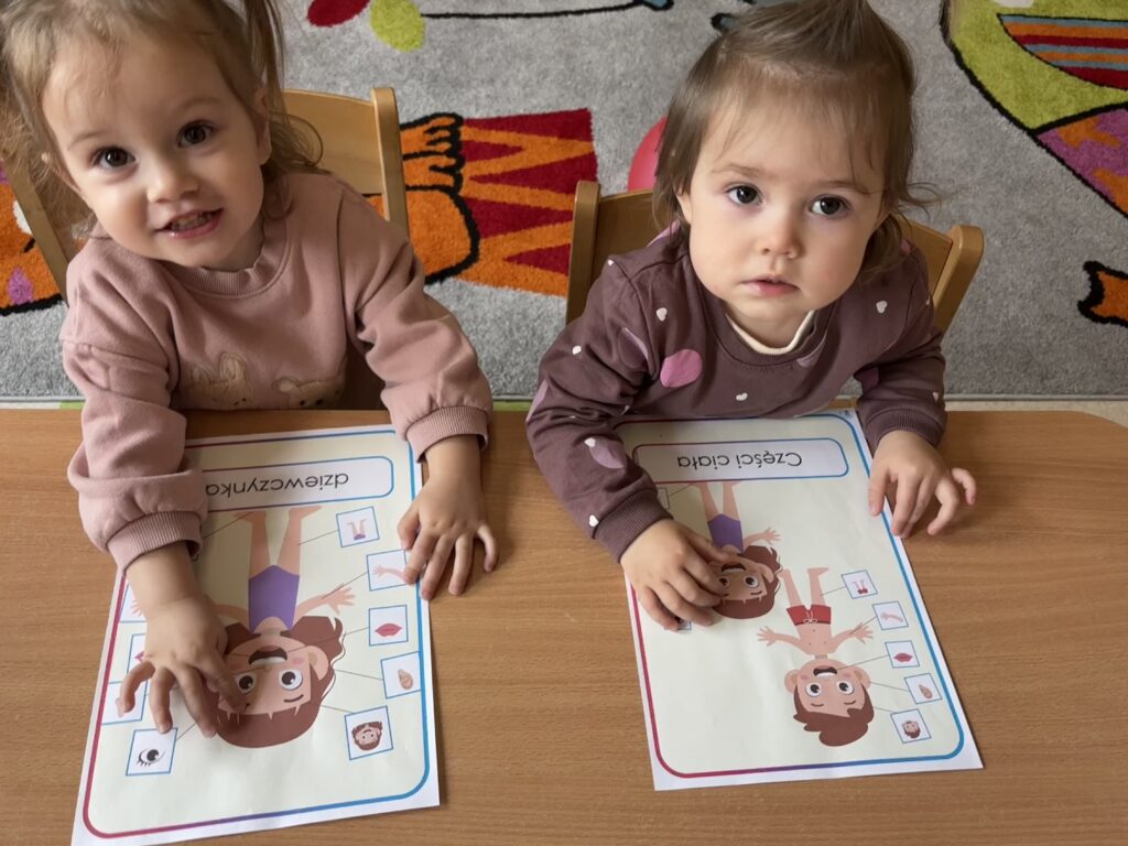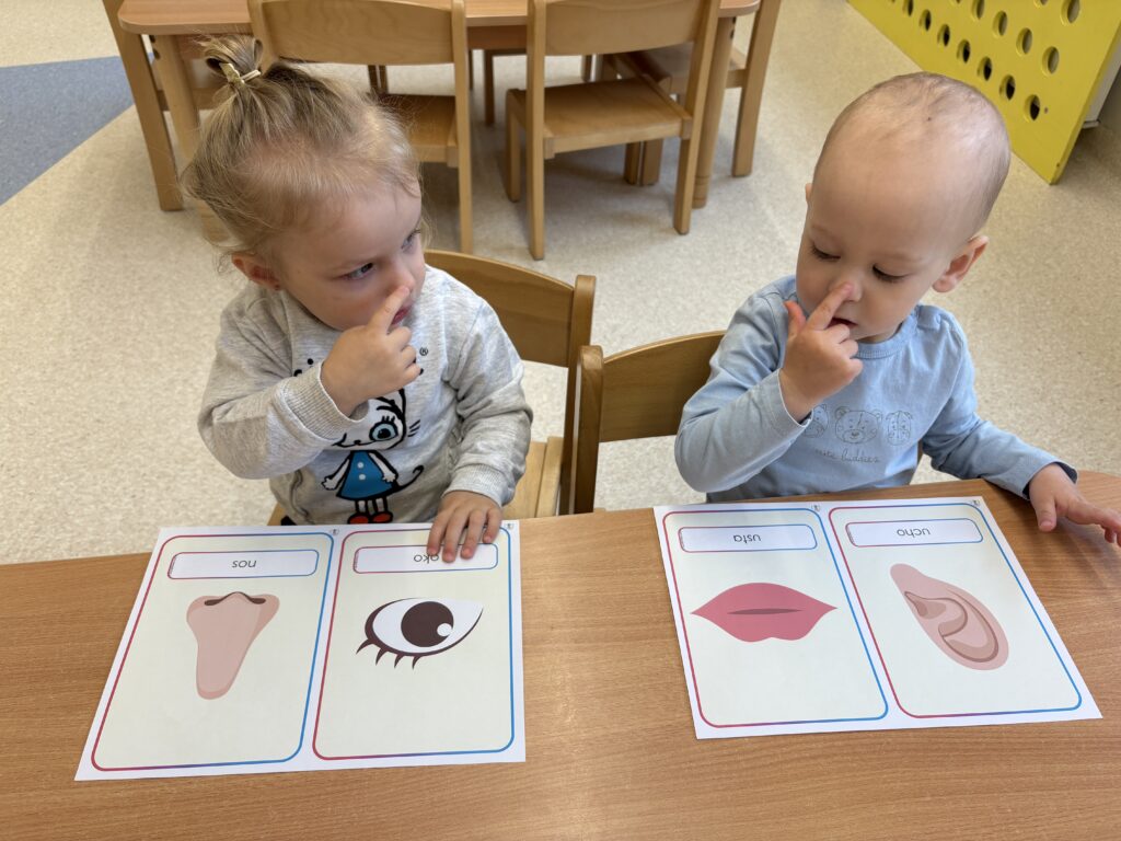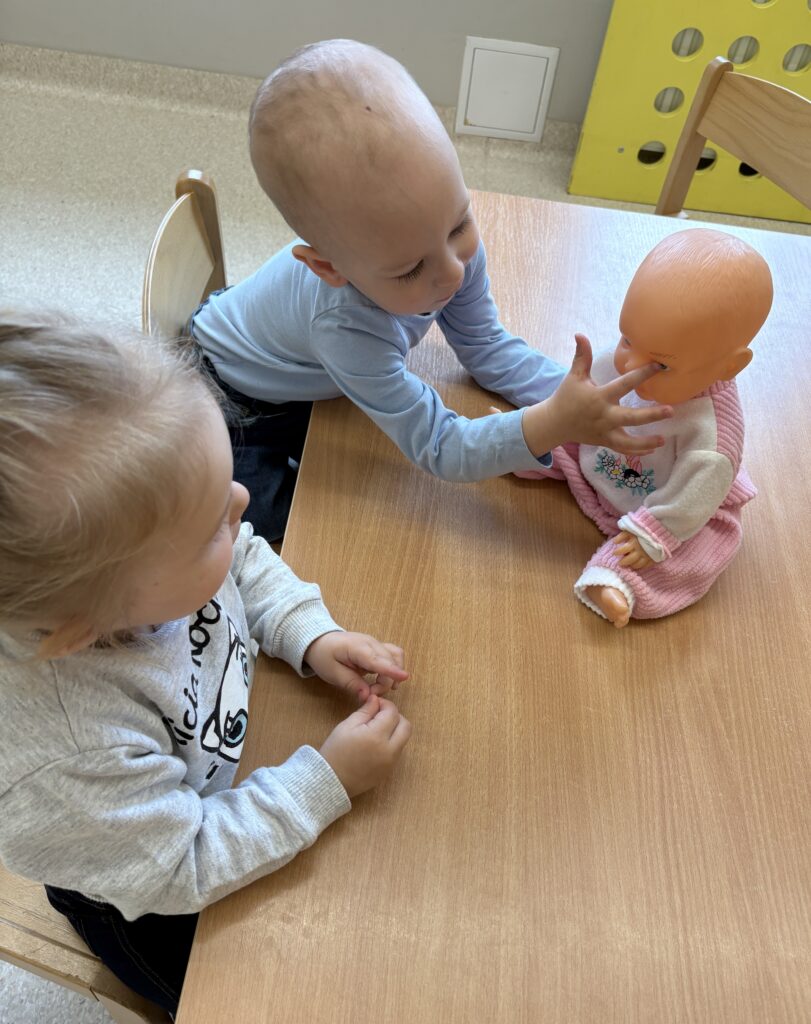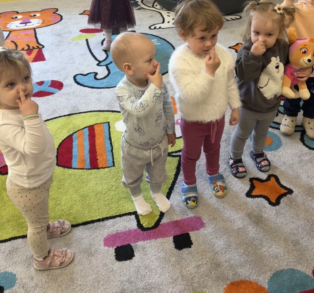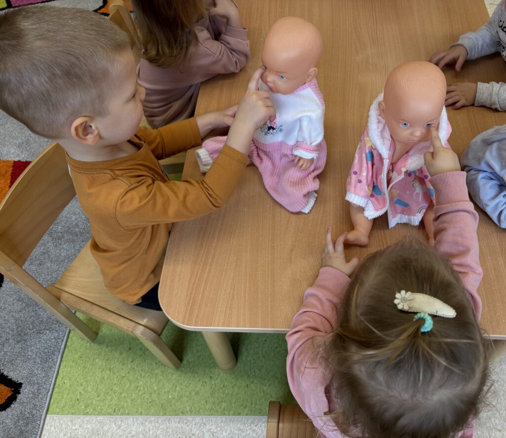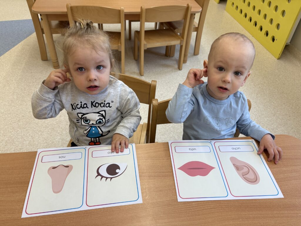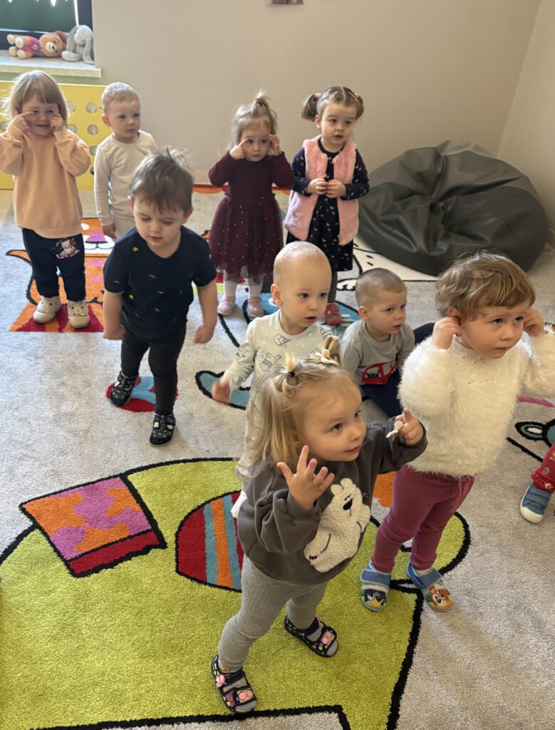 W minionym tygodniu w Klubie Malucha poznawaliśmy części ciała. Bardzo pomocne okazały się zabawy ruchowe z pokazywaniem do piosenek takich jak „Pokaż Grzesiu…” oraz „Głowa, ramiona, kolana, pięty..” w których dzieci chętnie brały udział.