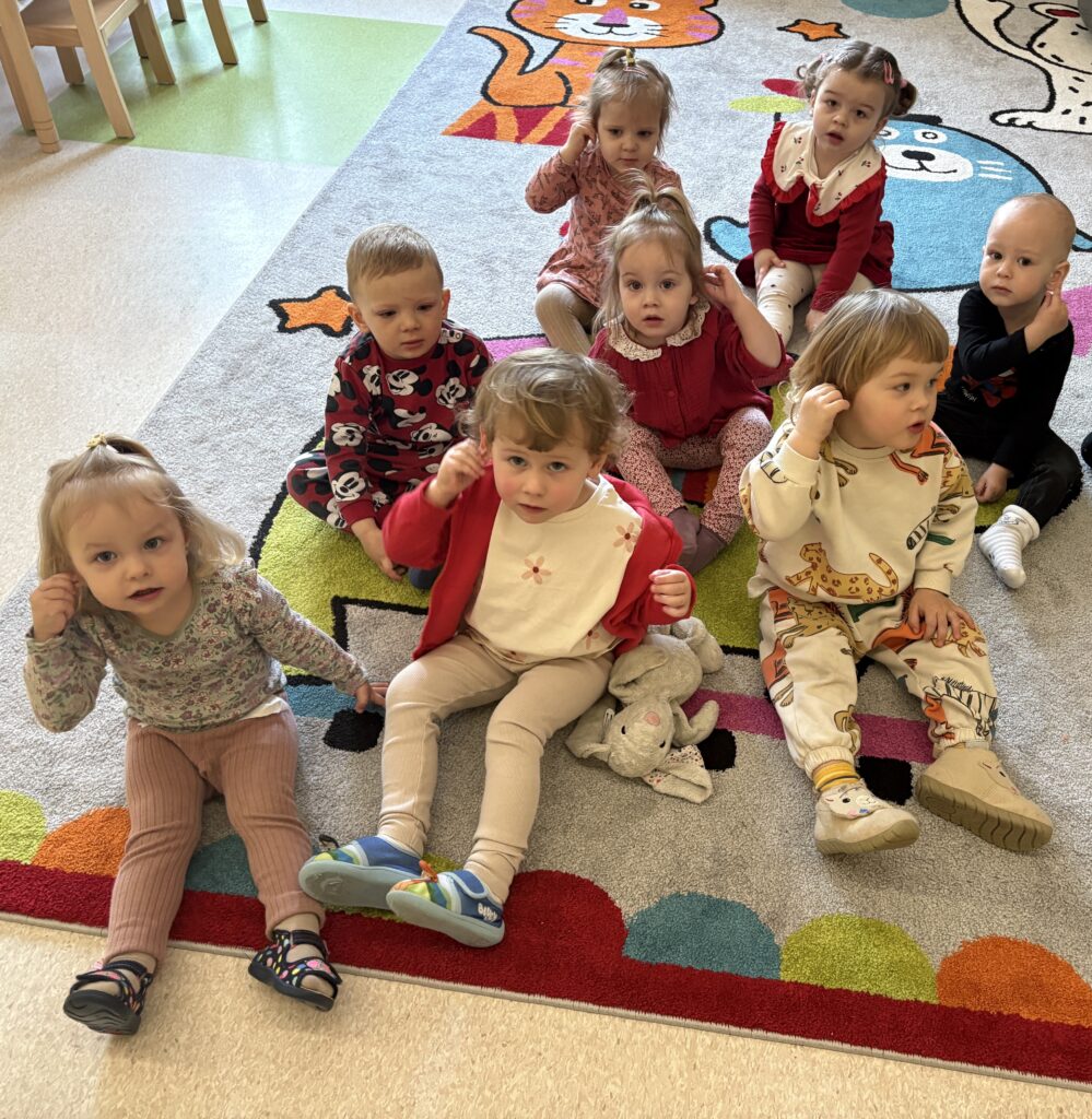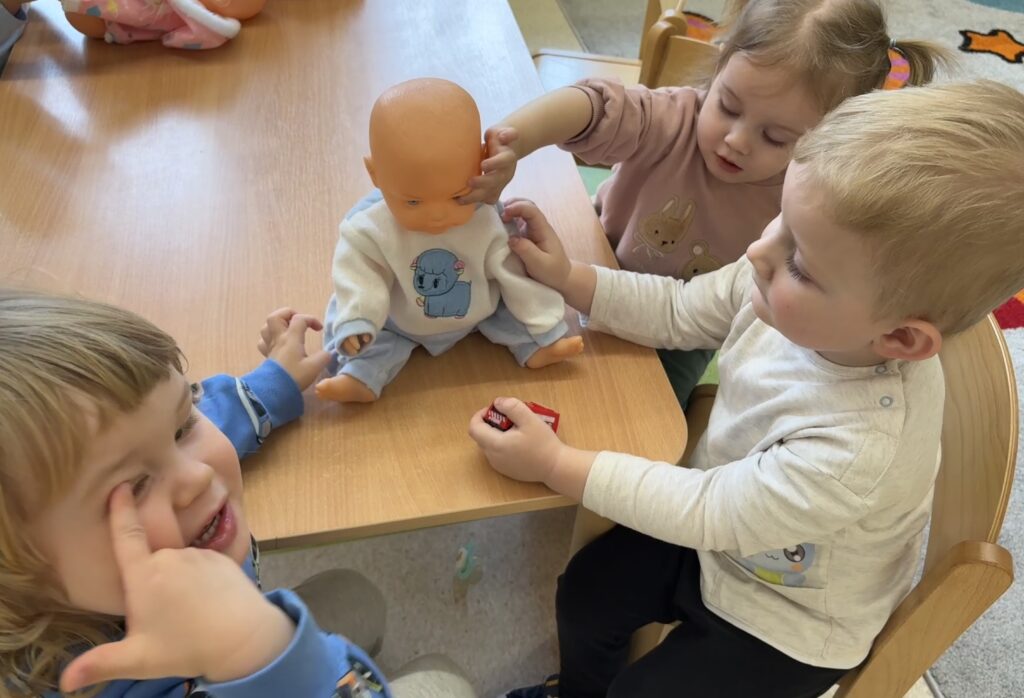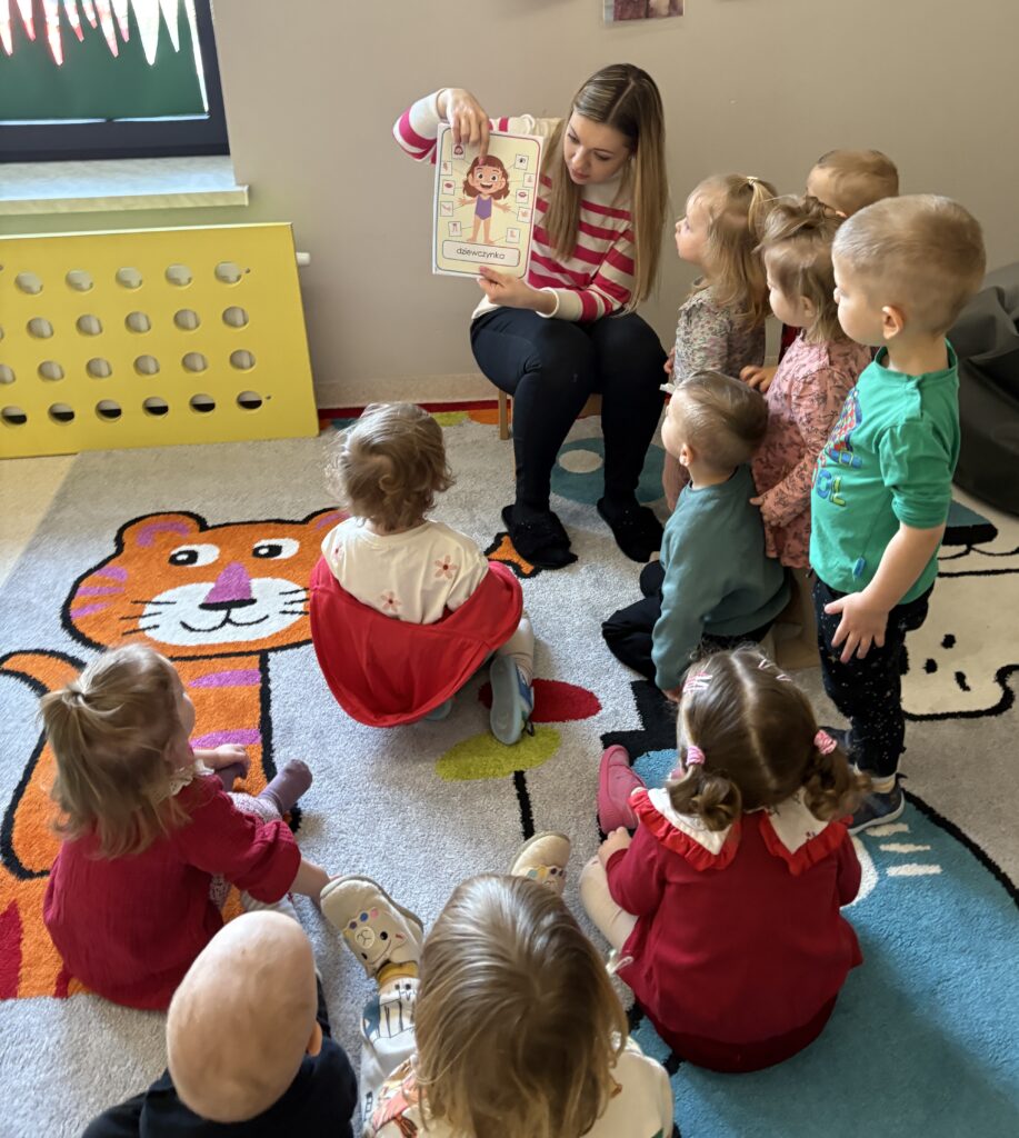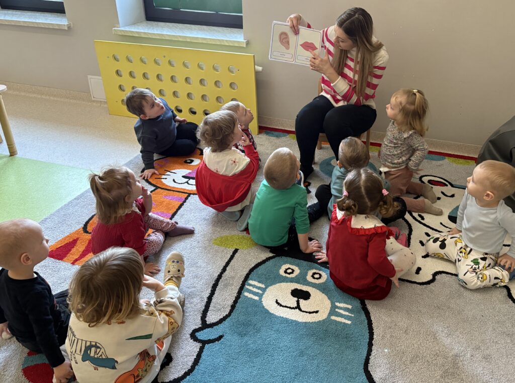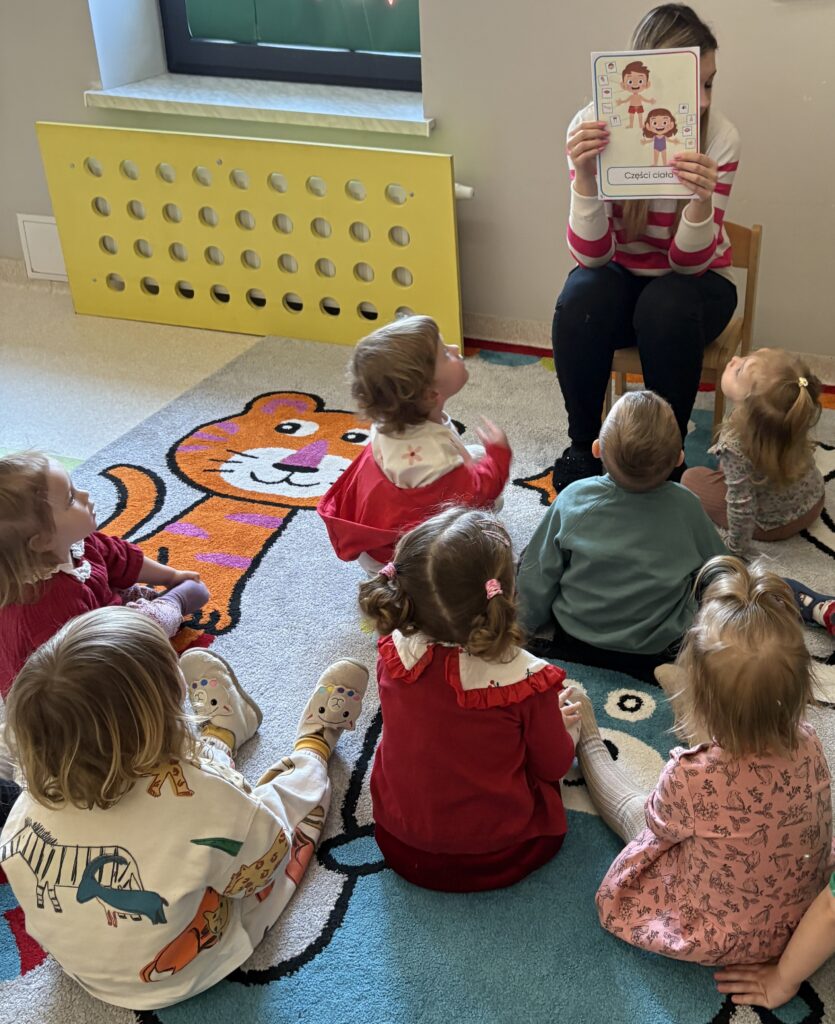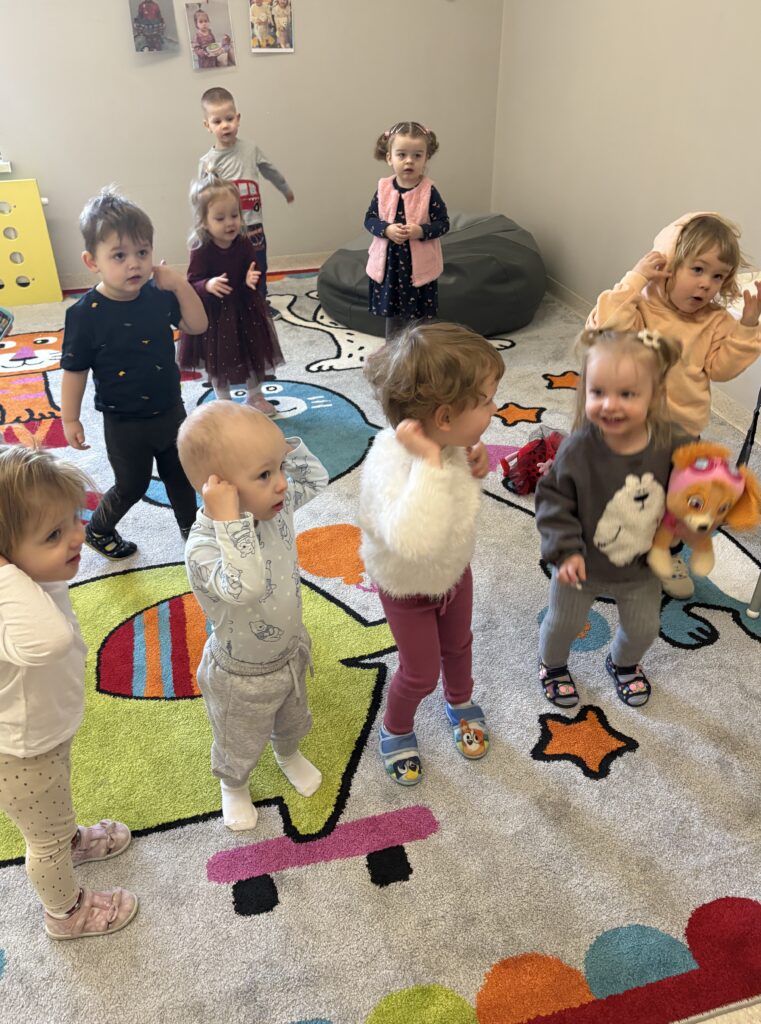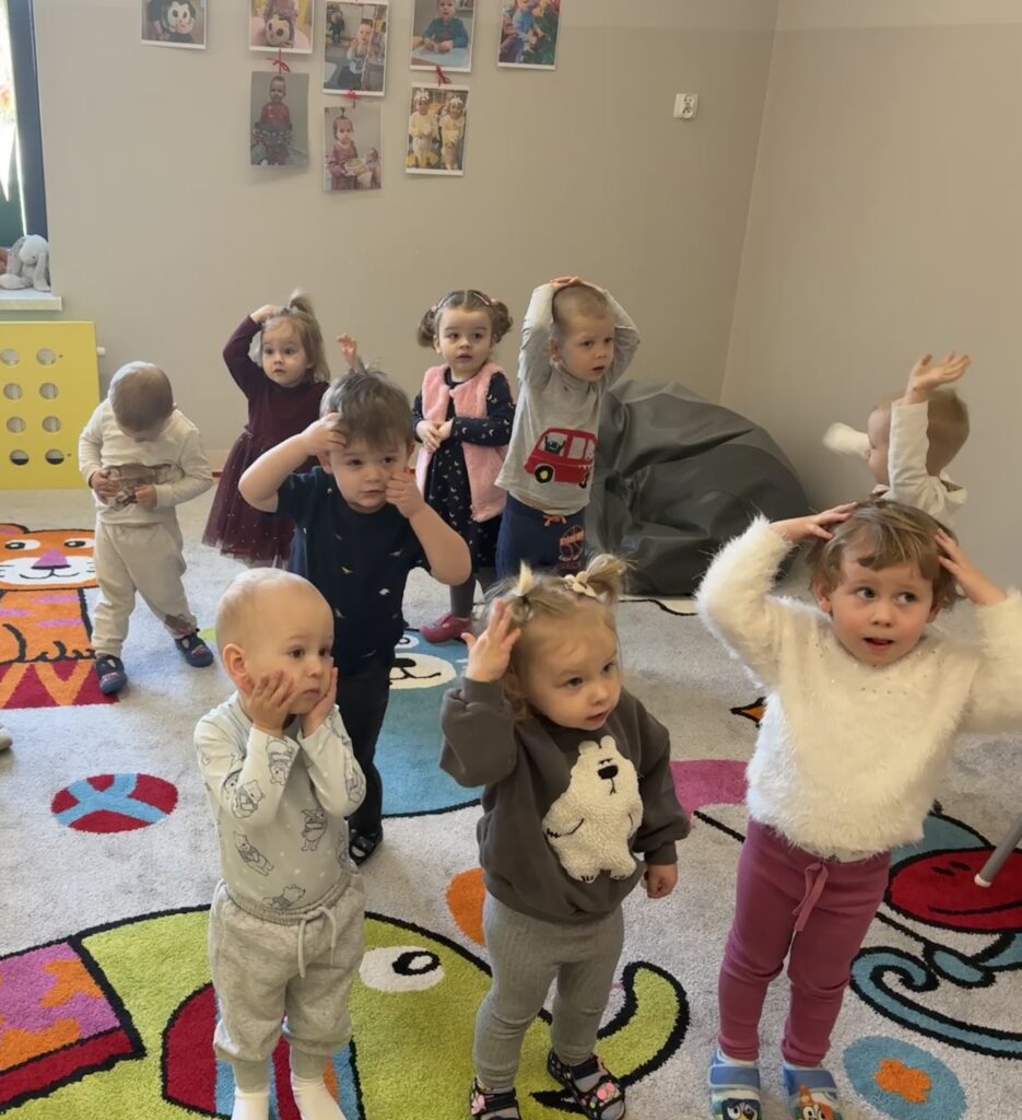 W minionym tygodniu w Klubie Malucha poznawaliśmy części ciała. Bardzo pomocne okazały się zabawy ruchowe z pokazywaniem do piosenek takich jak „Pokaż Grzesiu…” oraz „Głowa, ramiona, kolana, pięty..” w których dzieci chętnie brały udział.